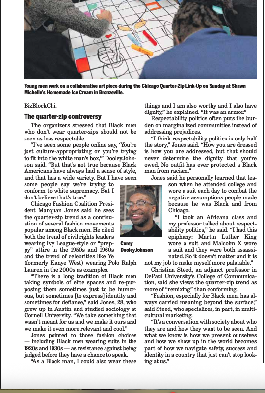 I had the joy of being quoted in the Chicago Sun-Times for a story that captures something deeper than a fashion trend. Yes, the quarter-zip is having a moment. But as I shared with the reporter, this is really a story about how young Black men are remixing culture in real time—using fashion as both expression and affirmation.